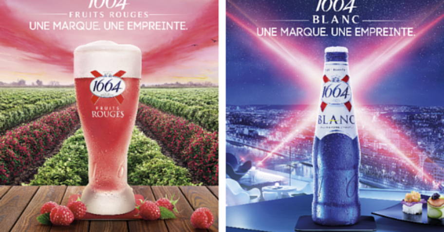 L’empreinte évoquée, en premier lieu, est celle de la cocarde de la marque, ces deux bandeaux rouges qui forment l’arrière plan de son logo. Ils sont maintenant au cœur des supports de communication de 1664, à commencer par les 5 visuels clés qui sont déclinés en affichage dans toute la France, ainsi que dans la presse écrite.