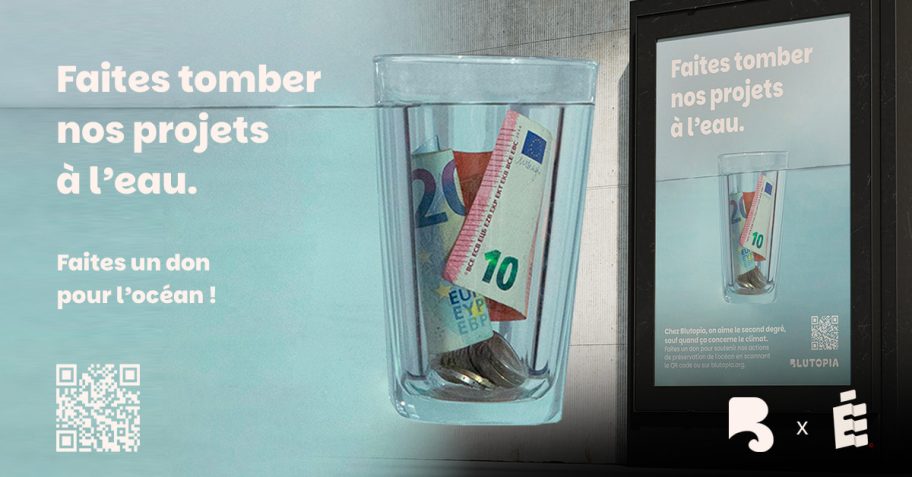 Lancée le 22 avril dernier, à l’occasion de la Journée de la Terre, « La campagne de don qui tombe à l’eau » imaginée par Blutopia et l’agence Étendard est actuellement visible partout en France, jusqu’au 5 mai. Déployée en print et en digital, elle interpelle les passants avec un visuel marquant : un verre rempli de billets et de pièces progressivement submergé. Son objectif : financer des actions de protection des océans tout en sensibilisant le grand public. Le tout porté par une accroche volontairement paradoxale : « Faites tomber nos projets à l’eau ».