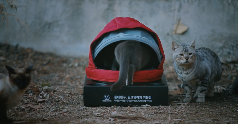 Aux vues de l’hiver rude et glaciale que traverse la Corée du Sud, deux marques ont pris la décision de s’associer et d’entreprendre la réalisation de 2000 « hottes » réalisées en vêtements recyclés. Ces hottes appelée « Hood houses » et destinées aux chats errants, ont la particularité de pouvoir tenir au chaud ces derniers et de leur fournir de la nourriture et de quoi se désaltérer.