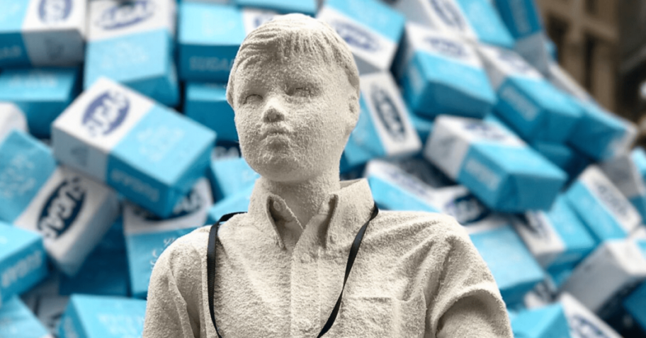 De plus, des sculptures d’enfants en sucre ont été fabriquées afin de toucher directement les parents et leur faire comprendre que le sucre peut être un véritable danger pour la santé.