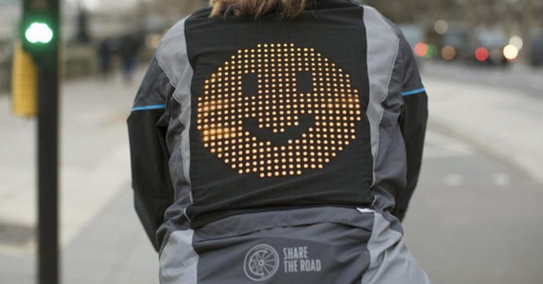 Sur le même principe que les feux de détresse sur une voiture ou les klaxons pour prévenir d’un danger soudain, les cyclistes possèdent une télécommande sans fil posée sur le guidon. Elle est reliée directement à la veste. Les emojis signalent aux conducteurs les déplacements et humeurs du cycliste.