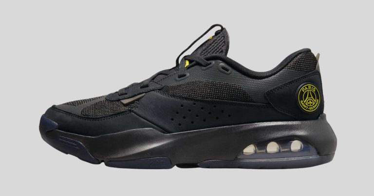 La nouvelle paire de baskets par Jordan et le PSG est pour le moins discrète ! Ici, pas de couleurs vives que l’on repère de loin. La marque et le club de football parisien choisissent de parer la chaussure principalement de noir. Du bleu marine vient s’ajouter sur la semelle avant. Seuls leurs logos arborent une couleur flashy. Celui de Jordan se trouve sur la languette, tandis que celui du PSG se trouve à l’arrière, sur le côté extérieur, et ils sont tous deux revêtus d’un jaune vif.