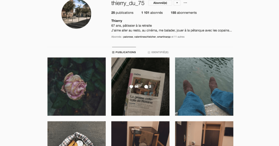 Comme la plupart des retraités, ses débuts sur la plateforme sont hasardeux, en effet Thierry semble être un peu à la rue… Post après post, on découvre la vie de Thierry avec ses maladresses d’usage. Grâce à un engouement de la part de sa communauté, Thierry apprend les codes du réseau social : hashtag, filtres, stories, tendances graphiques… @Thierry_du_75 sur Instagram