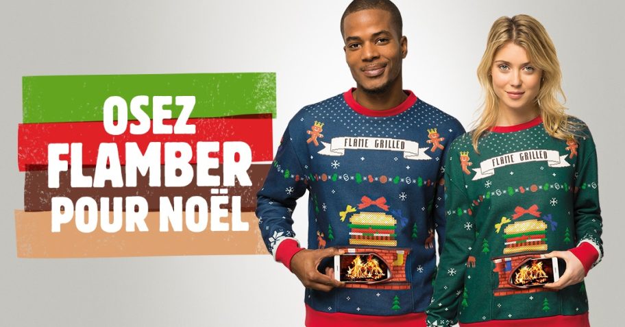 Burger King et Buzzman Paris viennent en effet de sortir l’un des must have absolus de ces fêtes de fin d’année : le pull de Noël. Cela peut sonner comme une blague, et pourtant, c’est très sérieux. Disponible sur Rad pour la modique somme de 29,90€, ce pull interactif représente un burger de l’enseigne, et est doté d’une petite poche au niveau du nombril. Pourquoi ? Pour accueillir un smartphone, bien entendu, et diffuser durant votre réveillon des images de feu de bois, à récupérer ici. Ambiance assurée !
